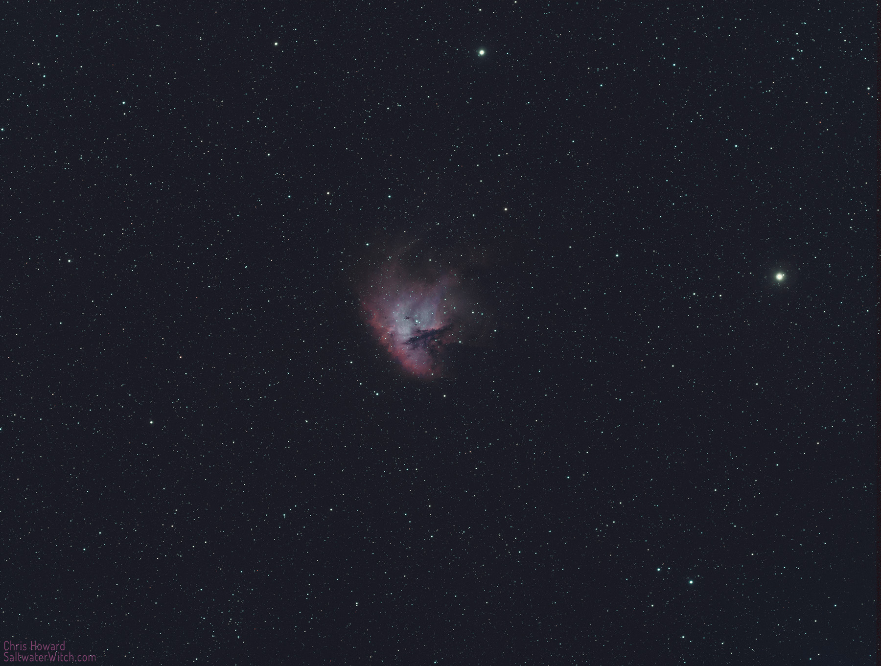 A wide-field view of the Pacman Nebula (NGC 281, IC11, Sh20184) in Cassiopeia (Ha + OIII), about 9500 lightyears away. The massive star on the right is α Cassiopeiae (or "alpha Cass" if you're on friendly terms) which makes up the right lower point of the W asterism of the constellation Cassiopeia. The bright star at the top is eta Cass, a binary star system that's only about 20 lightyears away from us, downright neighborly, and is not part of the W asterism.