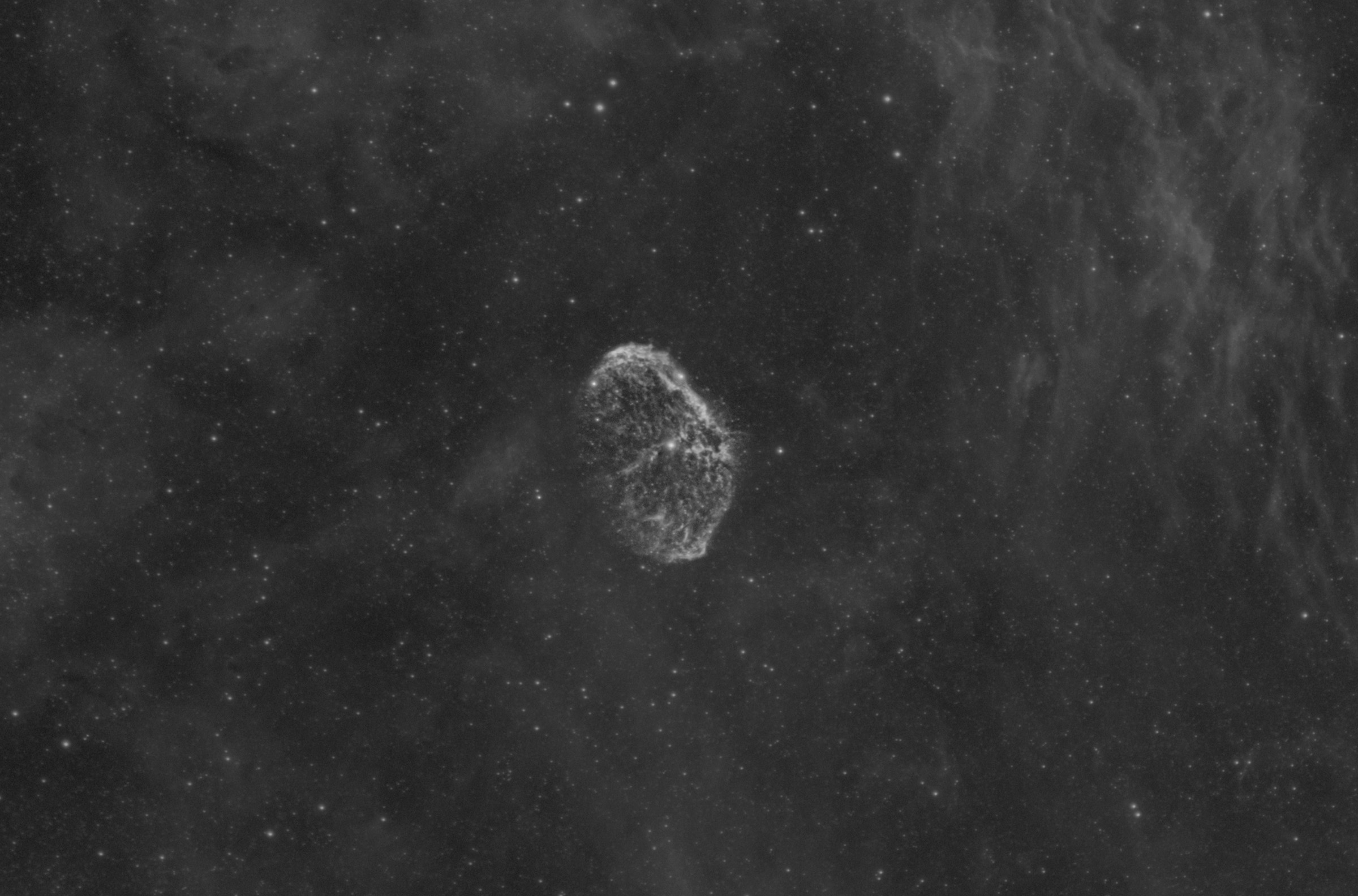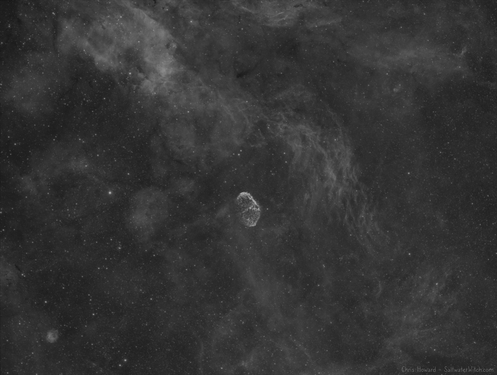 NGC 6888, the Crescent Nebula in Cygnus, is mostly made up of ionized hydrogen with a filmy envelope of oxygen (not present in this Ha-only data). Its longest side spans about 25 lightyears, or about 235 trillion kilometers (146 trillion miles), which at only 5000 lightyears away, is a pretty good-sized deep sky object. I spent the entire night capturing hydrogen-alpha data, over 60 subs, 53 of which I used in this stack. I will come back on another night to capture the OIII data. Notes: William Optics SpaceCat51 apochromatic refractor, ZWO ASI1600MM-Pro monochrome camera cooled to -10C, 53 x 300-second subframes (about 4.5 hours of data) stacked in DSS, ZWO AM5 EQ mount, ASIAir Plus controller. (I ordered the ASIAir early August—backordered, and it arrived a couple weeks ago. This is only my second time out with the Air, and I can already see this being be my away-from-home controller).