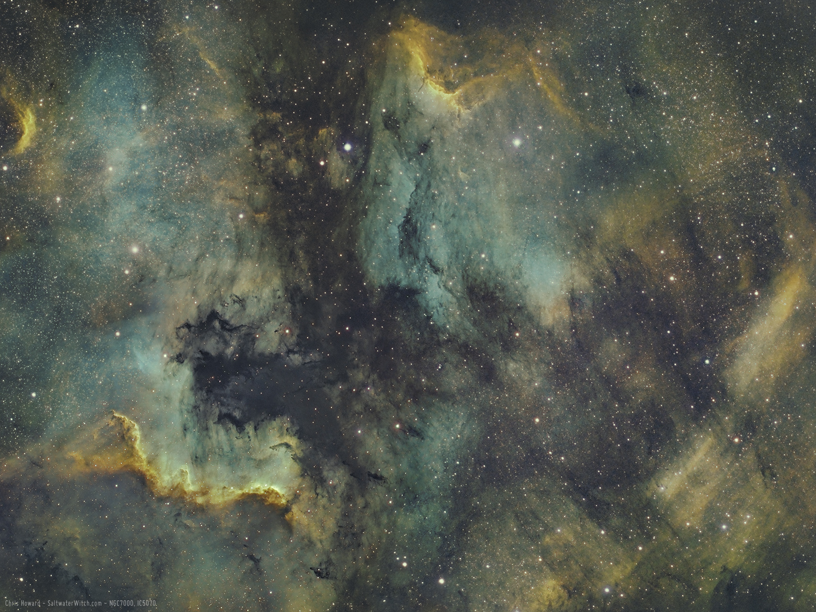 North America Nebula (NGC 7000, left) and Pelican Nebula (IC 5070, top right) in the constellation Cygnus. Narrowband in the SHO palette. 68 x 240 second subs in Ha, OIII, SII. I kept the Hydrogen (green) levels pretty even.