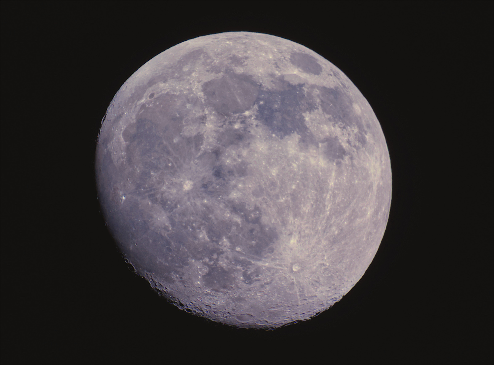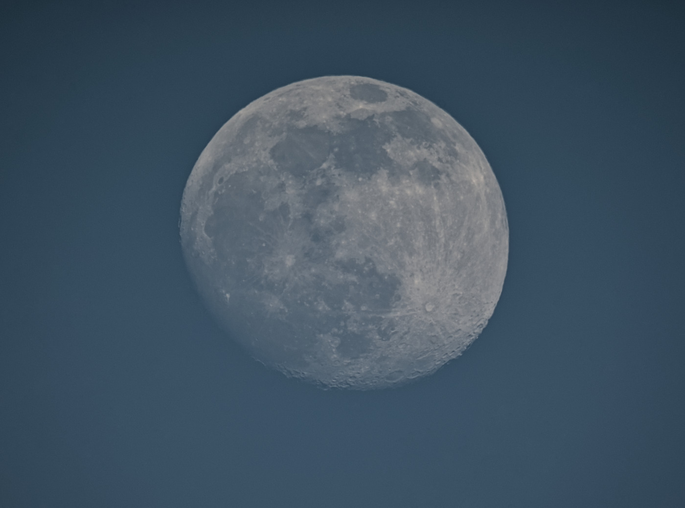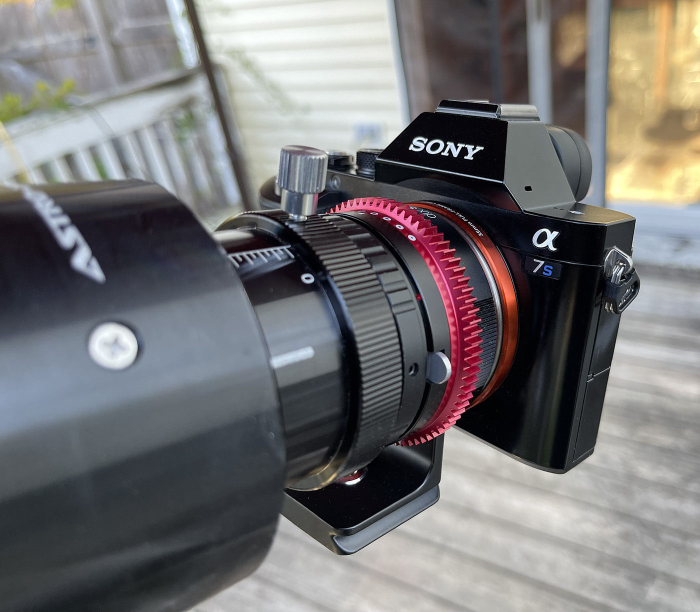 [Update: I shot this with the Sony A7S on the Astro-Tech AT6RC 1350mm f/9 scope while preparing for the total lunar eclipse May 15-16th, 2022. Unfortunately, the clouds moved in a day after taking this and didn't leave until after the eclipse. So I missed the main event, but did get some pretty nice test shots. This is a single exposure, f/9, 1/60 sec at ISO 400 with the Sony Full-frame A7S]. Here we are around 9:15 pm, this time with the Celestron UHC/LPR Filter: