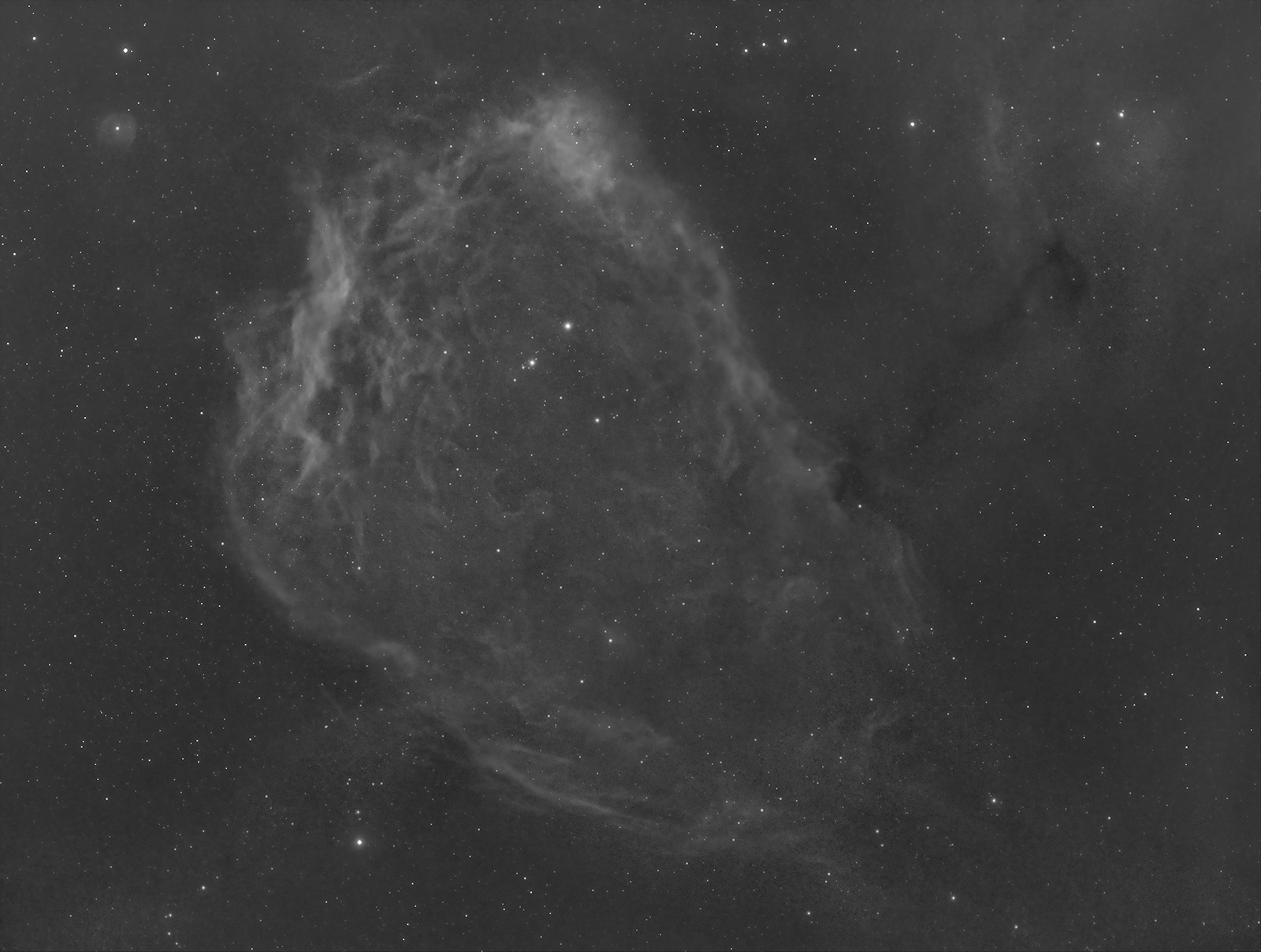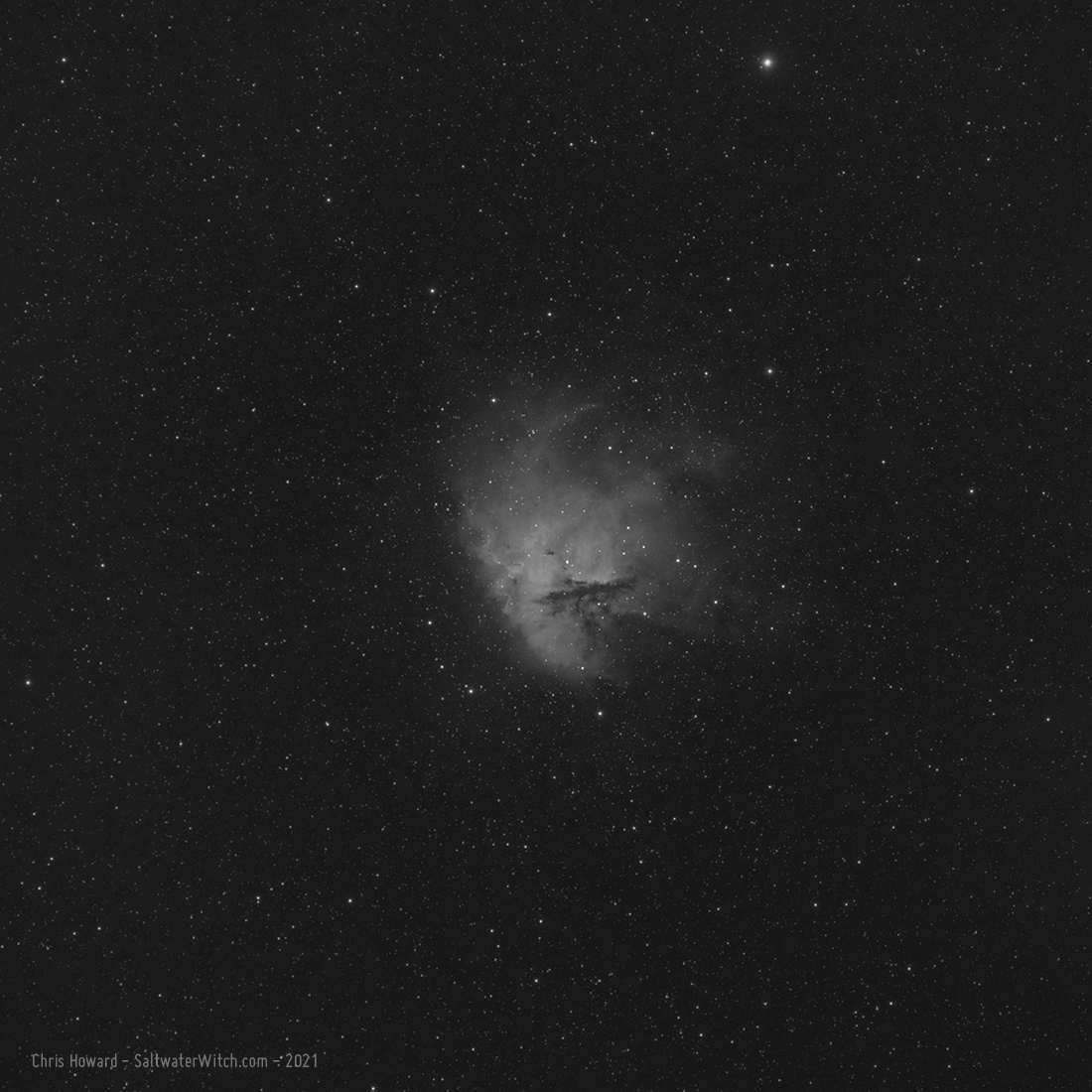 Imaging notes: 57 x 300-second subs in 3 nanometer hydrogen-alpha. No calibration frames. Guiding was better than expected, with total RMS hovering between .7 and .9 arcseconds. Seeing was below average--astronomical seeing, which is impacted by turbulence and temperature differences in the atmosphere. It's pretty common to have a clear night with terrible seeing. There's a time and place for twinkling stars--like writing a song, but they're the bane of astrophotographers. Gear notes: ZWO ASI1600MM-Pro monochrome camera, Antlia 3nm Ha Pro narrowband filter, William Optics SpaceCat 51 apochromatic refractor, Sky-Watcher EQ6-R Pro mount.