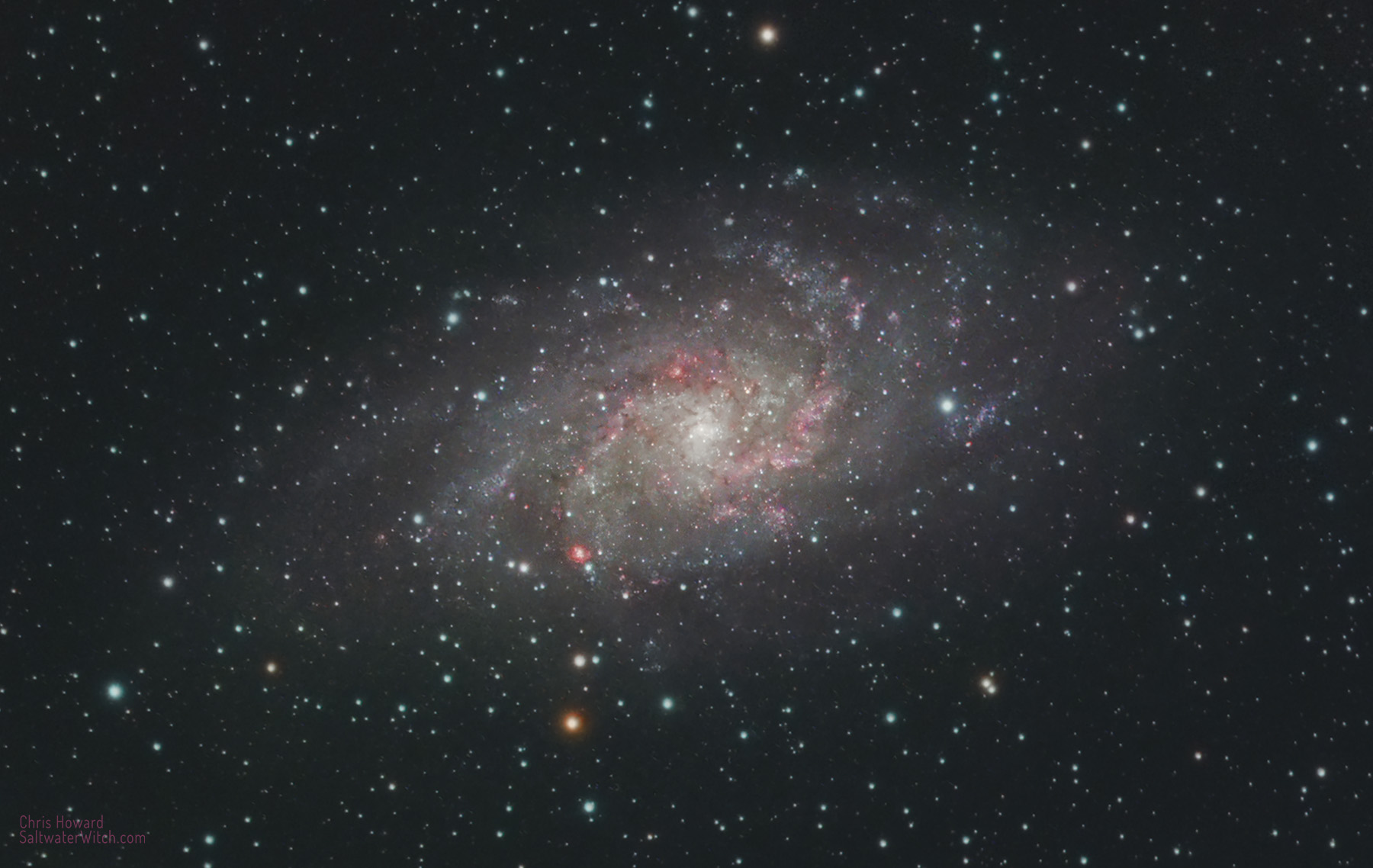 M33, the Triangulum Galaxy in Ha+RGBColor with the SpaceCat51 and ZWO ASI071MC cooled color camera + Atik 414EX monochrome camera. I processed some 2018 and 2019 data to see what kind of detail I can get out NGC 604--that's the large pink mass at the middle bottom of the galaxy in this rotation. NGC 604 is a vast HII region, much brighter and 40 times larger than the Orion Nebula in our galaxy. M33 is a little under 3 million lightyears away.