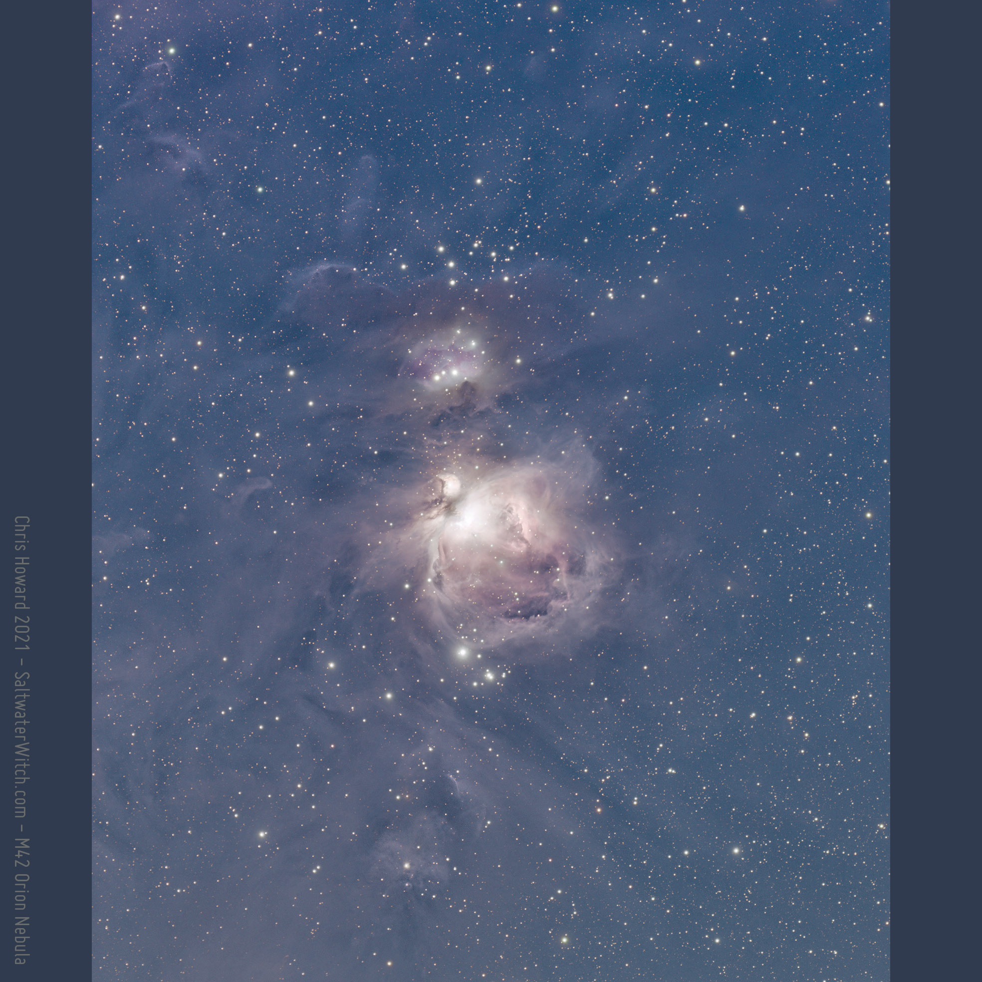 From last night's imaging run: The Orion Nebula (M42) is one of my all-time favorite deep sky objects, and the Constellation Orion is in my top five places to go with a telescope. Imaging Notes: Ha+RGB, Ha: 55 x 240-second subs, color: 123 x 120-second subs stacked in DSS, processed in PSCC2022. William Optics SpaceCat51 Apo refractor, ZWO ASI071MC cooled color camera & ASI1600MM-Pro monochrome camera, Controller: INDI, Ekos, KStars.
