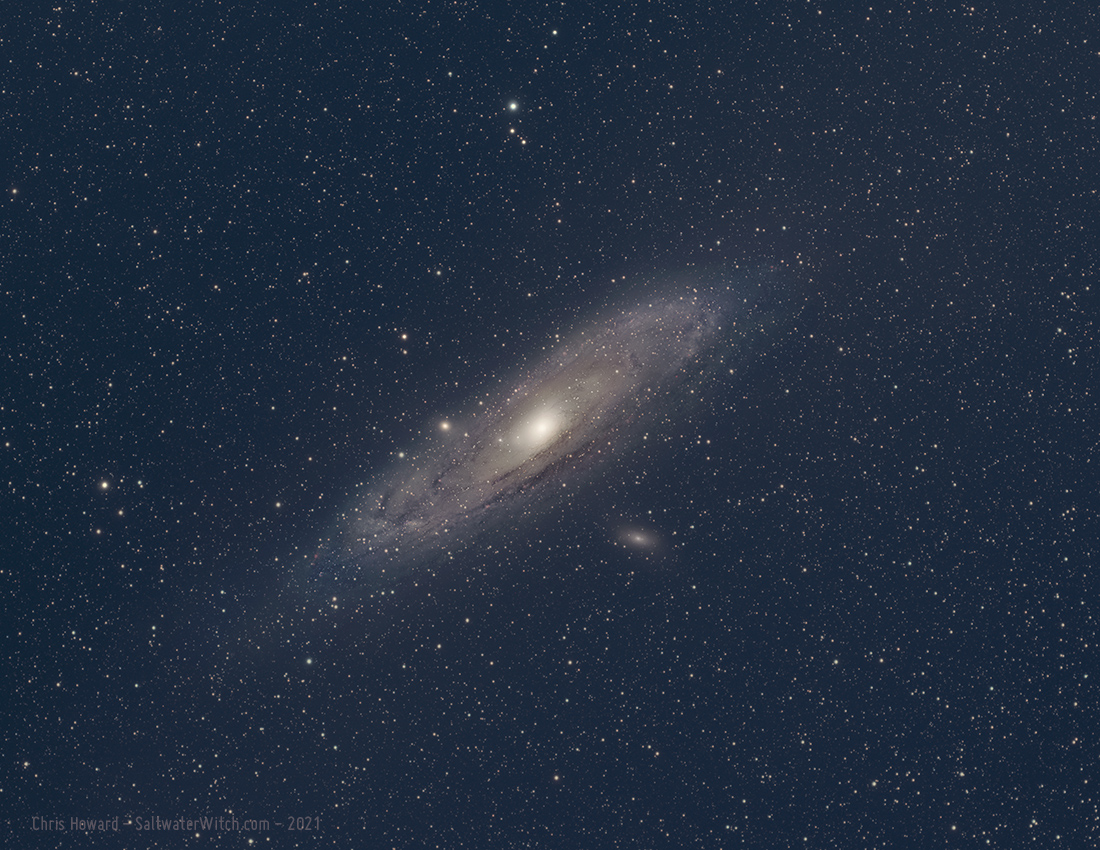 Andromeda (M31) was the first deep sky object I captured with a camera--an old Nikon D40x DSLR. The Orion Nebula (M42) was the second. For many years M31 was my favorite galaxy and it is in many ways the ideal galaxy; it's a massive spiral at the perfect photographic angle from our perspective, here in the middle of our own galaxy. At two and a half million lightyears, it's not far away. And while M101, the Pinwheel Galaxy, is perfect from a galactic structure point of view, being a face-on from our perspective (or top down), Andromeda is cinematically posed for all of us taking pictures from earth. Galaxies are not really my thing. I usually focus on narrowband imaging of nebulae, supernova remnants, and other large structures within the Milky Way--so, thousands of lightyears away, not millions. I almost always shoot with sub-1000mm focal lengths, and galaxy imagers are usually running with 2000mm or more. OTAs of 3000mm and up are common.