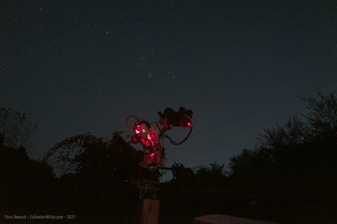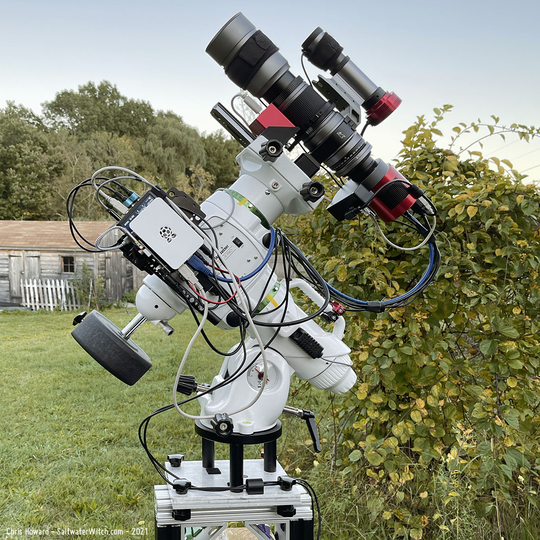 Here's my astro setup for the last couple nights, my wide-field narrowband rig, with the William Optics SpaceCat 51 APO refractor and the ZWO ASI1600MM-Pro monochrome camera, ZWO electronic filter wheel and autofocus. Sky-Watcher EQ6-R Pro equatorial mount. Controller: Raspberry Pi 4 4GB running INDI/Ekos/KStars.