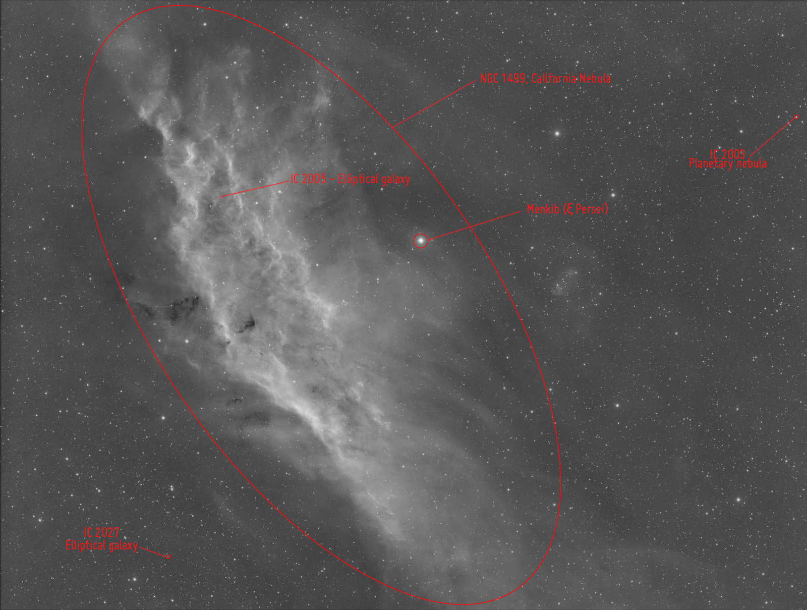 NGC 1499, the California Nebula, is a large HII region and star-forming cloud in the Constellation Perseus. Its 100 lightyear length is roughly shaped like the State of California—I mean, you can see the San Joaquin Valley, the Sierras and where the land angles in for southern California and the L.A. Basin. So, the name fits the shape. NGC 1499 is east of the Perseus Molecular Cloud, a large star-forming region surrounding the star clusters, IC 348 and NGC 1333, but also includes a bunch of hot O-type stars on their own. The HI supershell in Perseus, a broader backdrop of atomic hydrogen and helium, encompasses the molecular cloud as well as the California Nebula. Almost every nebula I have ever imaged is within our galaxy, the Milky Way, but what's interesting with NGC 1499 is that our solar system and the California Nebula are both in the Orion Arm of the Milky Way, about 1200 lightyears apart. It's just up the galactic street from us. We're practically neighbors!