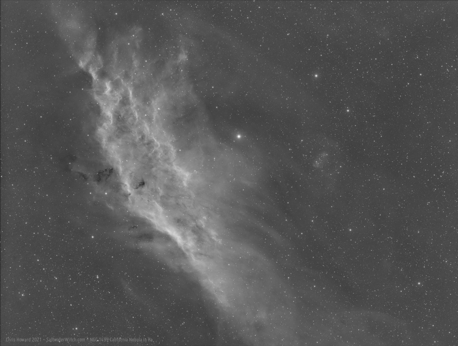 I started another narrowband imaging run of the California Nebula (NGC 1499), this time in 3nm. Here's my first pass of 100 x 240-second sub-exposures in hydrogen-alpha (Antlia 3nm Ha filter) with my ZWO ASI1600MM-Pro monochrome camera and William Optics SpaceCat 51 Refractor (250mm FL @ f/4.9).