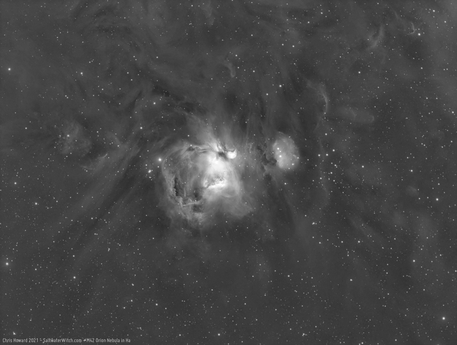 More fun with the Antlia 3nm Ha filter on the William Optics SpaceCat 51. 55 x 240-second stacked subs of the Orion Nebula and surrounding clouds of atomic hydrogen.