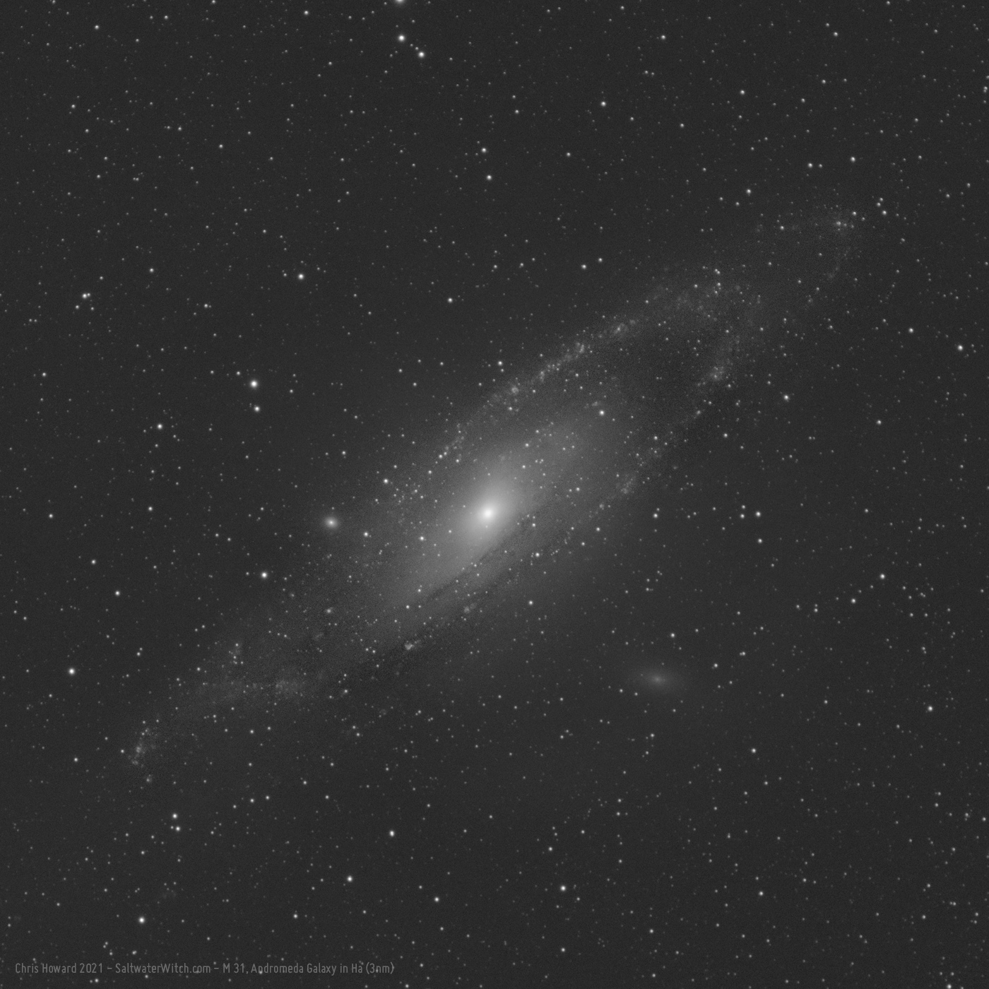 Here it is in hydrogen-alpha, just the one narrowband slice of the spectrum. Andromeda Galaxy, Messier 31, is probably the first target for northern hemisphere astrophotographers--well, it's either M31 or M42 Orion Nebula. Both are intensely bright deep sky objects you can see without a telescope, given reasonably clear and dark skies. I have captured M31 more times than I can count. The galaxy stands out in the night sky when it swings around every year, making it an easy target. Galaxies are also great full spectrum targets for color cameras, DSLRs and mirrorless cameras, but that doesn't mean you can't pull some awesome data out of Andromeda in narrowband or infrared. I captured M31 in near-infrared (longpass 850nm) a couple years ago, and last night I captured our galactic neighbor in very narrow hydrogen-alpha (3nm Ha), and this stacked set of 42 sub-exposures highlights massive HII regions, mostly emission nebulae, along the outer spiral arms, with dense bands of dust and debris ringing the galactic core. This will make a great red channel in an RGB image, or I may go with HaRGB.