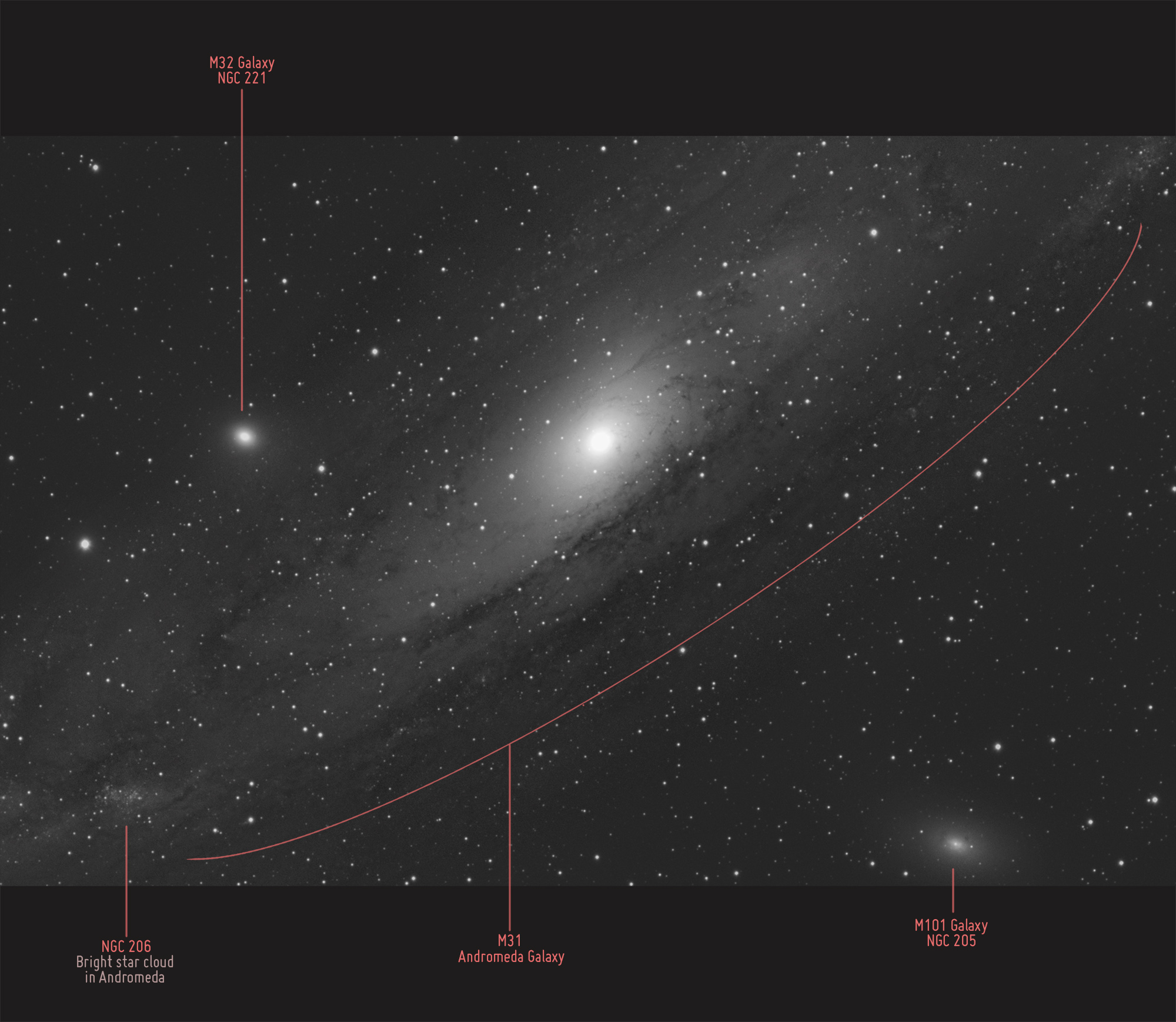 This is the blue bandpass of the Andromeda Galaxy (M31), revealing dense spirals of dust that wind through starfields and curl around the galactic core. I have labeled NGC 206, one of the brightest of the star clouds inside Andromeda, along with a couple of M31's captive galaxies (M32 and M101). Imaging Notes: 51 x 120-second stacked subs from my WilliamOptics SpaceCat51 (250mm FL) and ZWO ASi1600MM-Pro mono camera.