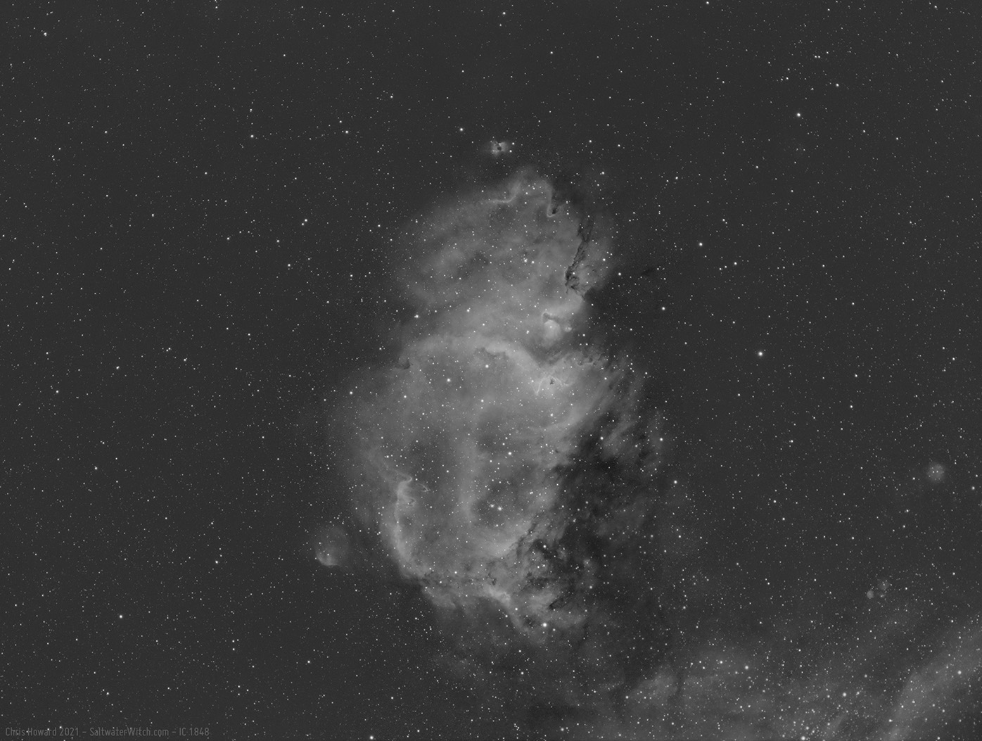 From last night's imaging run: Soul Nebula (Westerhout 5, Sharpless 2-199) in the Constellation Cassiopeia, 65 x 240 second stacked subs with the William Optics SpaceCat51 APO refractor, ZWO ASI1600MM-Pro monochrome camera, and the Antlia 3nm Ha Pro narrowband filter. The designation IC 1848, which is the catalog entry for the star cluster in the lower right region of the nebula, but it's popularly used to refer to the entire nebula. The Soul is a massive star-forming region about 6500 lightyears away, with several open clusters, including CR 34, 632, and 634.