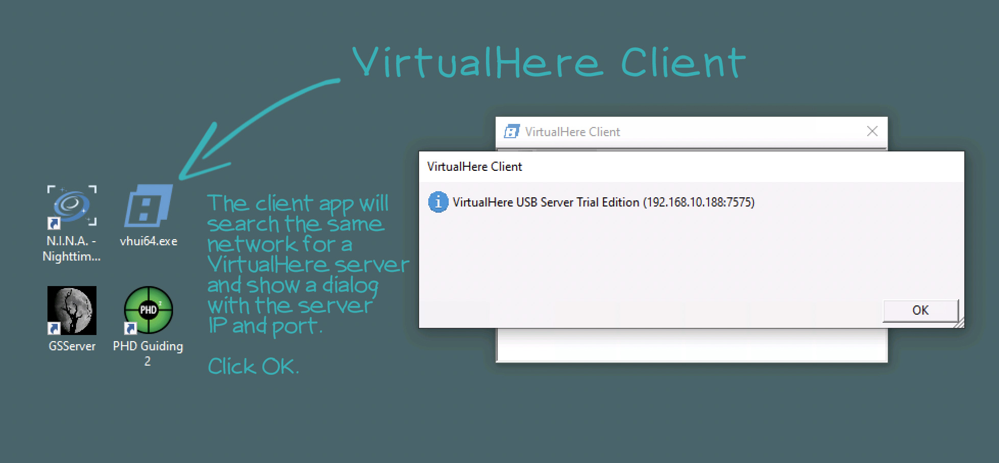Double-click the app. On Windows it's vhui64.exe (Windows 64-bit VirtualHere Client app), and you should see the VH Client open with a dialog that gives some info about the VirtualHere Server it found on the network—the one running on the Raspberry Pi.