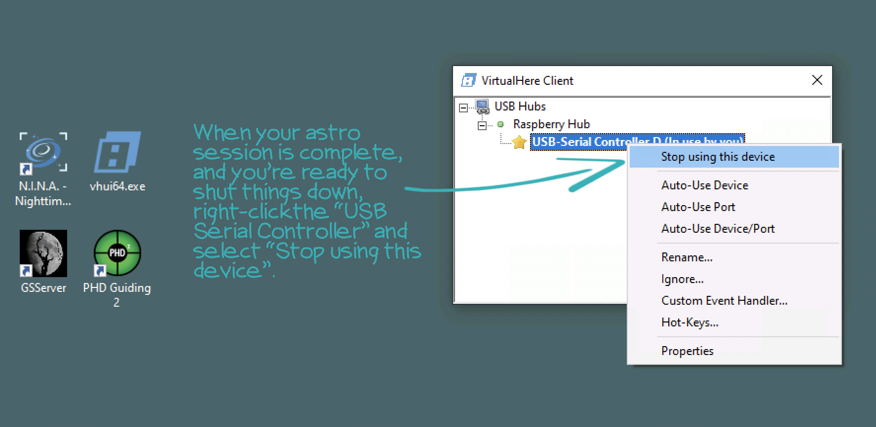 The last step, after you have disconnected the Mount in EQMOD, GS Server, NINA, SGP, etc., go back to the VirtualHere client app and select "Stop using this device" to disconnect the link to the Virtual USB server.