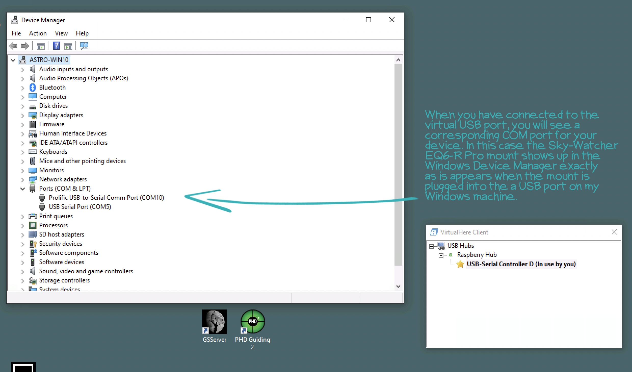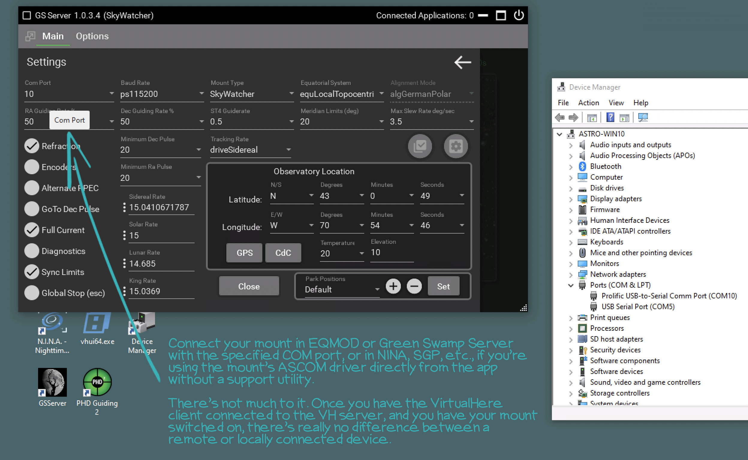 It's the coolest thing when you open the Windows Device Manager and see the "Prolific USB-to-Serial Comm Port (COM10)" under Ports (COM & LPT). That's the EQ6-R Pro virtually connected. From there, you run everything normally—start up EQMOD or Green Swamp Server, connect your stuff, and start imaging.