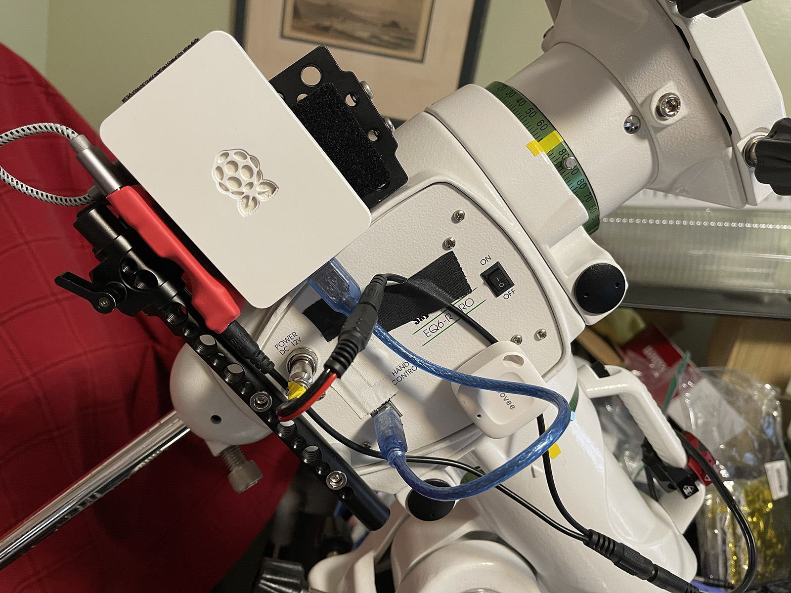 Here's my Sky-Watcher EQ6-R mount with Raspberry Pi 4 attached. Another 12v 10amp line runs from my power supply to these two with a splitter.