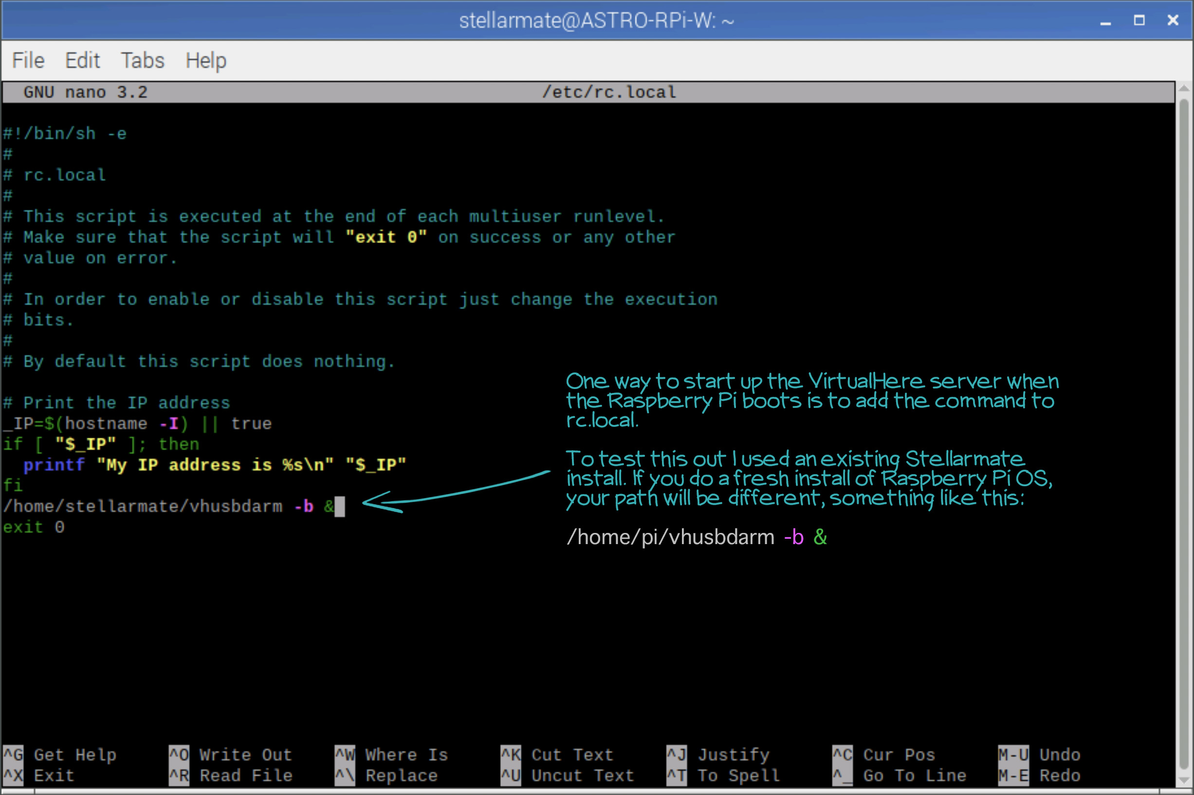 Setup the server to start with the Pi's boot, adding it to rc.local, using nano to edit the file: