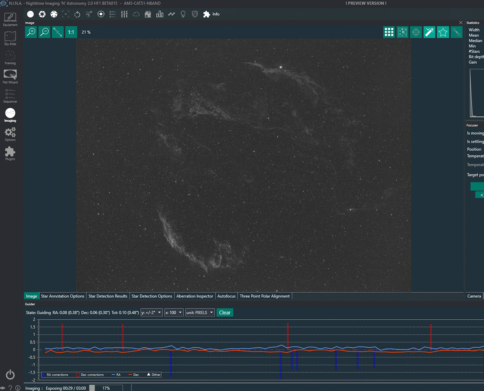 I swung the scope south to IC 4665—I just picked a nice star cluster in Ophiuchus, near the meridian in the south. I cleared calibration in PHD2, ran a new calibration, and then guided for an hour. I ran with defaults, 1 second exposures. Total RMS error through the session was between 0.4 and 0.7 arcseconds. And then I jumped into a bunch of 180 second subs of the Veil Nebula in Ha, watching the guide graph hovering in the high .4s and low .5s.