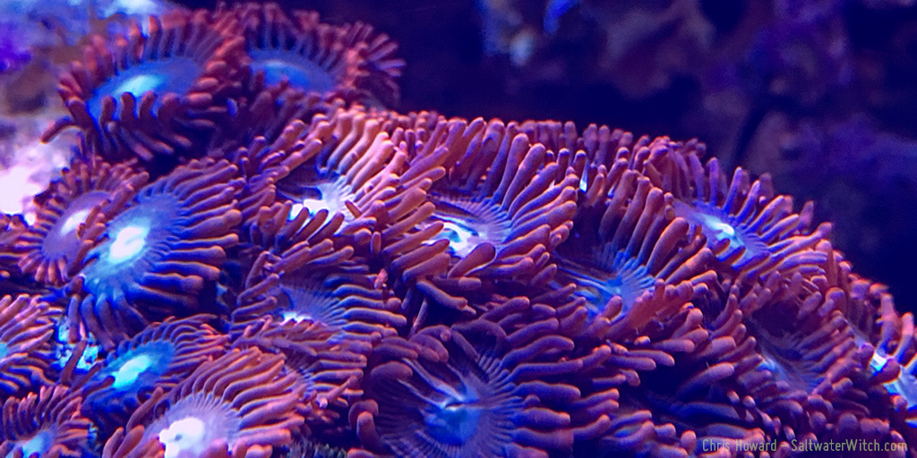 Shots of some of the zoanthids in my tank. I love these red guys with the dark blue-black centers. In the trade, it's normal to come up with fanciful names for most corals, like Fruit Loops and Purple People Eaters. I always want to call these reds "deadpool zoas" because of the similarity with his mask.